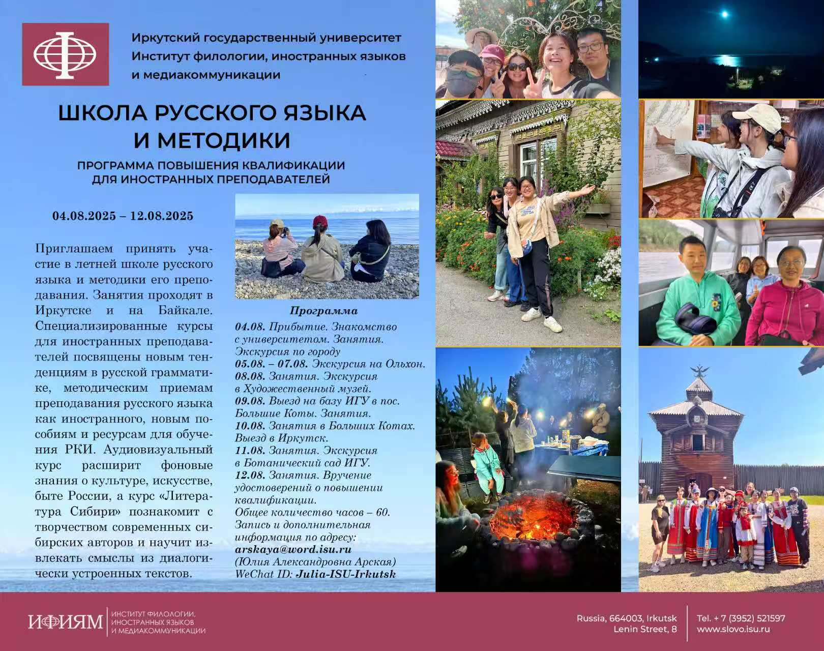该暑期学校聚焦俄语教学方法,课程在美丽的伊尔库茨克和贝加尔湖进行。学校将在9天时间里为外国教师进行教学方法的培训,开设的专业课程涉及俄语语法的新趋势、俄语作为外语的教学方法并介绍新的教材和资源。视听课程将扩展您对俄罗斯文化、艺术和生活的背景知识,“西伯利亚文学”课程将介绍当代西伯利亚作家的作品。