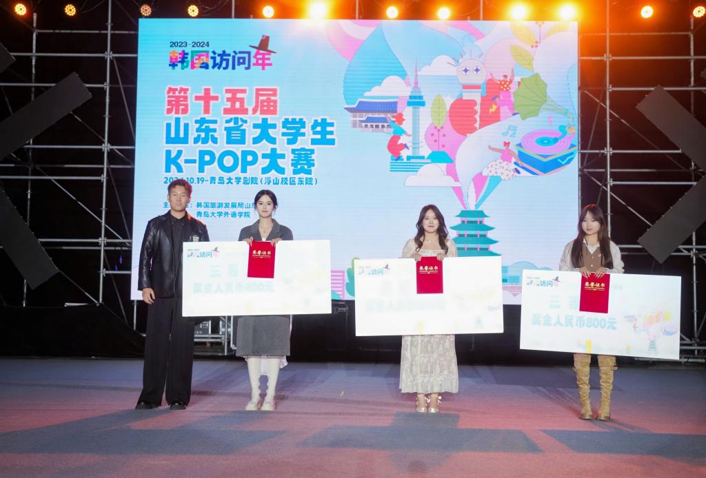 10 月 19 日,第十五届山东省大学生Kpop 大赛在青岛大学剧院(浮山校区东院)精彩上演。来自山东省多家高校的 20 名选手同堂竞技。经过一天的激烈角逐,评委会选出了一个一等奖、两个二等奖、三个三等奖和 14 个优秀奖,我院朝鲜语专业赵蕊蕊同学荣获三等奖。 此次山东省韩国语歌曲 Kpop 大赛的成功举办,不仅为广大韩国语专业学生提供了一个展示自我的平台,也促进了山东省各高校之间的文化交流。