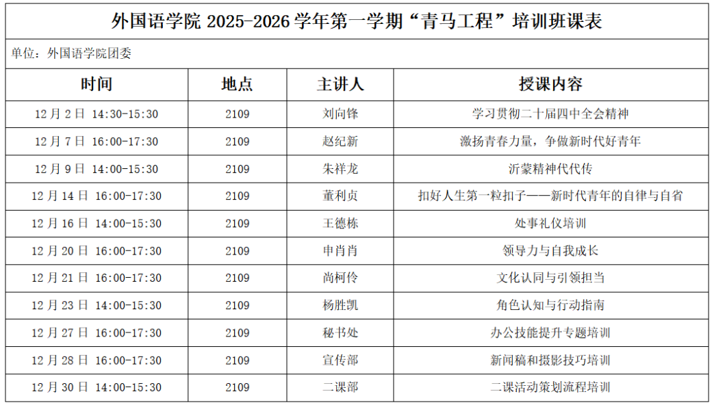 本届“青马工程”培训班聚焦青年成长与团学工作需要,精心设计多层次课程体系,旨在进一步强化青年的使命担当,提升报国本领,引领学员以“青春之我、奋斗之我”砥砺初心、锤炼品格,在新时代的青春赛道上奋力奔跑、勇毅前行。